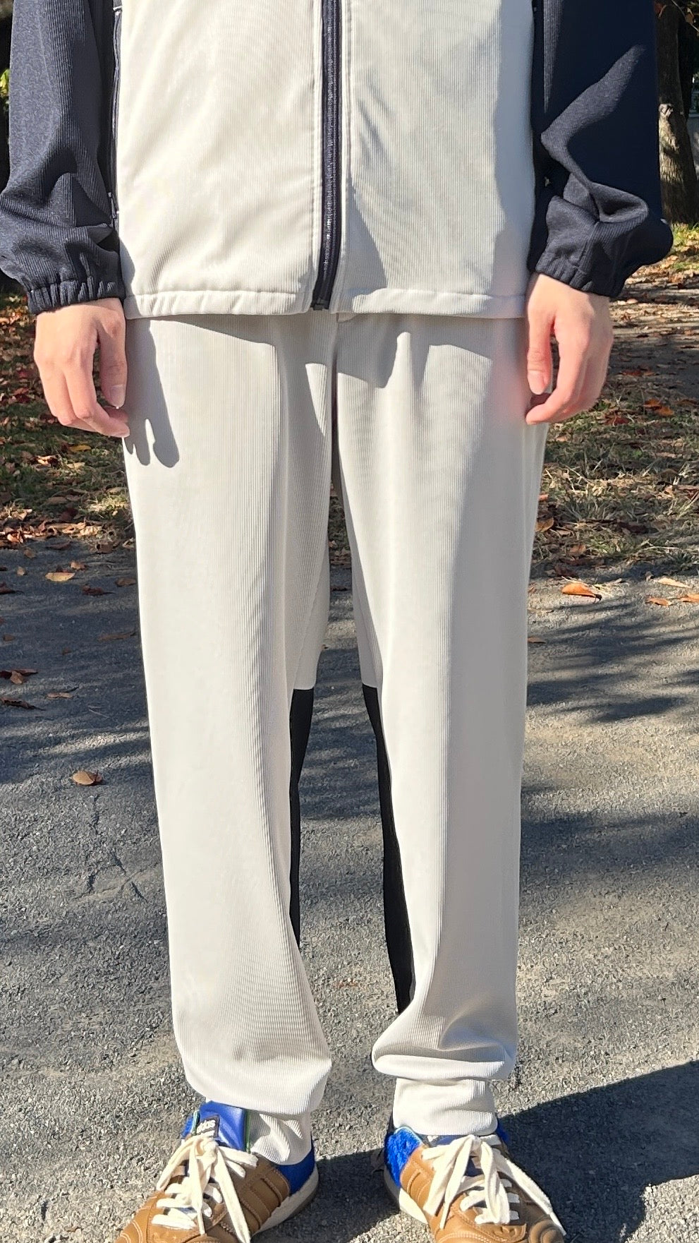 ベーシックなカラーで、お手持ちのアイテムとも合わせやすい商品となっておりますが、同時発売のバイカラージップブルゾンとのセットアップが抜群です。